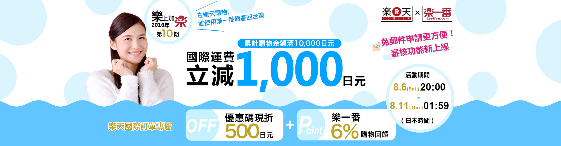 8月內樂天新用戶初次在樂天購物滿5,000日元可享500積分,詳情請見:http://www.leyifan.com/cht/announcement/2638.html