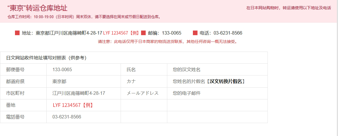 限于乐一番用户在日本网站进行购物收货使用,请勿使用仓库地址作为开店联系地址及其它非法用途,一经发现将永久封号并冻结没收在库商品、账户余额,